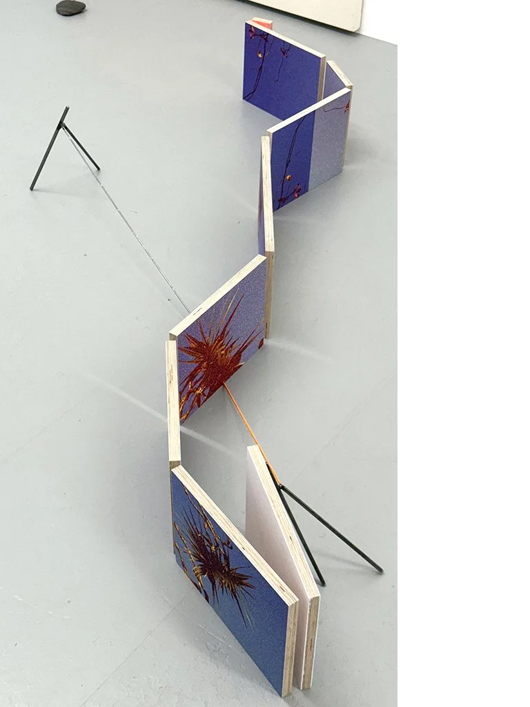 Impressions à jet d'encre sur photo-rag, acier, roche, peinture, contreplaqué, toile.Inkjet prints on photo-rag, steel, paint, rocks, plywood, canvas. Light Metals Heavy Waits, 2025 espaces flottants, Montréal. Documentation Paul Litherland, Stephan Kowal and courtesy of the artist.
